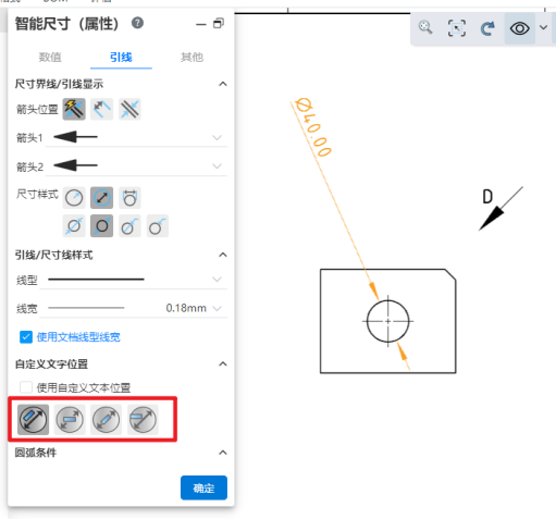 - 文本位置:支持在“文档属性-尺寸-角度、弧长、倒角(仅引线)、直径、半径(仅引线)、线性”中为对应的尺寸设置默认文本位置。控制对应尺寸命令中“自定义文字位置”的默认状态。