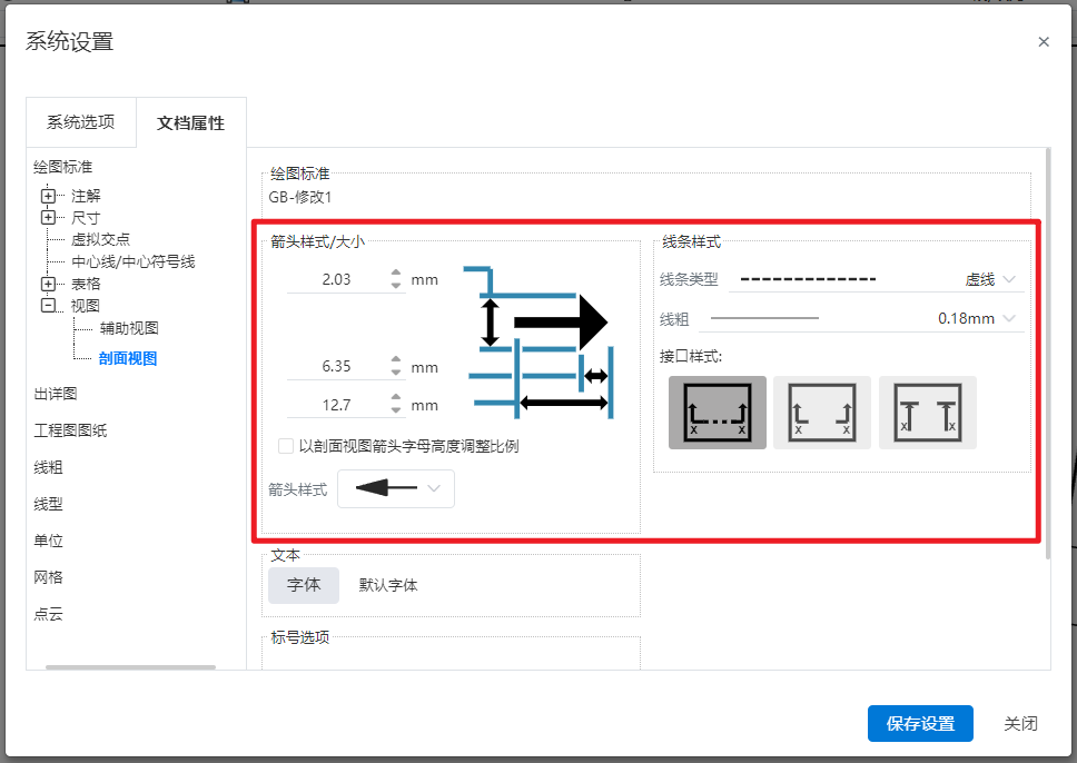 文档属性-视图-剖视图中新增箭头样式及线条样式设置组。