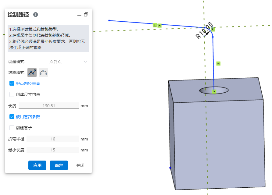 使用管路参数:勾选后,绘制路径的后续所有尺寸参数置灰,并使用“管路参数”中的数据。若不勾选,用户可以自定义管路参数。