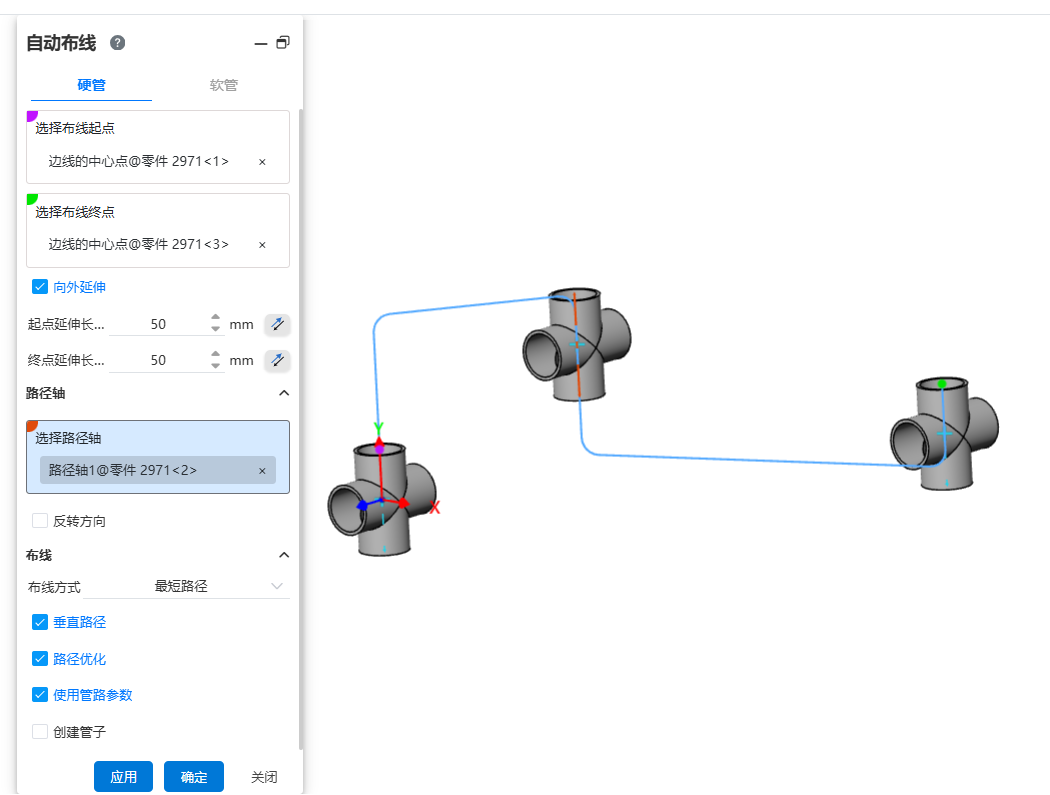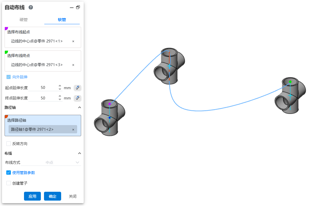 自动布线通过Tab页区分硬管和软管,自动布线时,支持拾取多个路径轴且按照拾取的顺序从起点-路径轴1-路径轴2-……-终点的顺序自动布线。