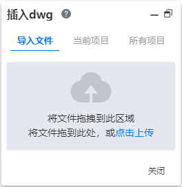 支持直接导入本地dwg文件插入到草图内。点击导入按钮后文档会被导入到项目内并插入到当前草图。