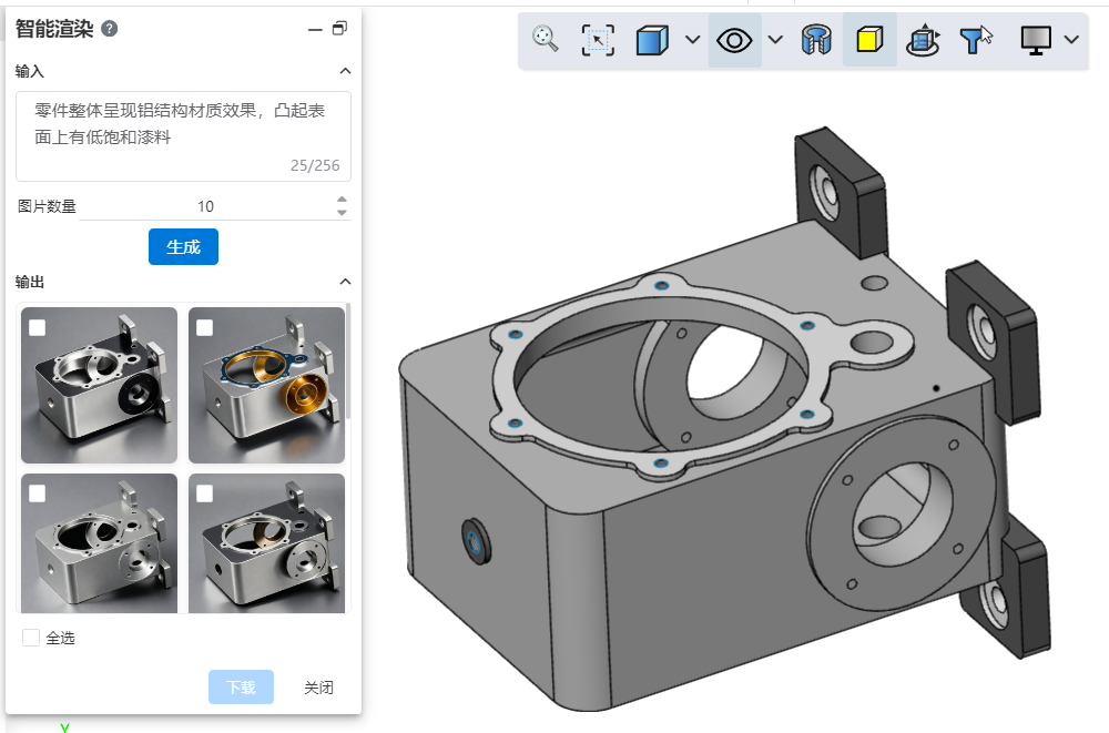 使用智能渲染功能,支持通过现有的三维模型,结合用户输入的文本及特定要求,自动生成多张高质量的图片,并支持下载。