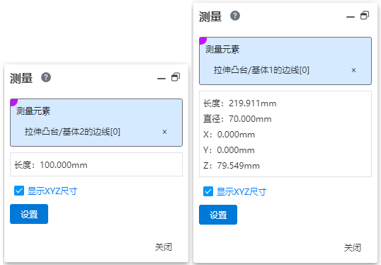 测量实体边线、圆、两元素尺寸。