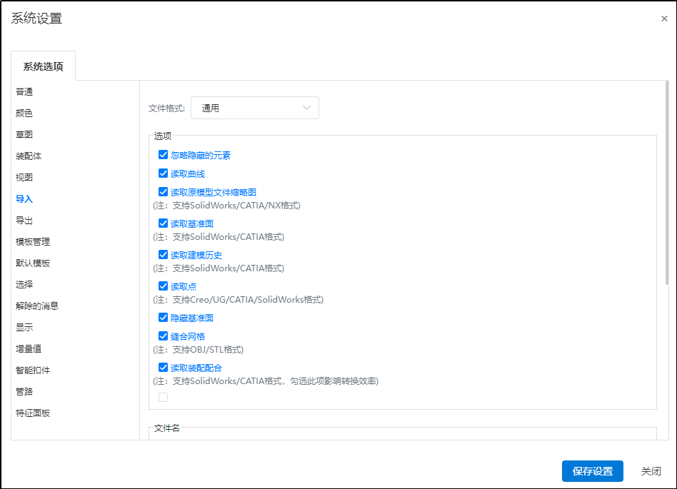 【读取原模型文件缩略图】:控制是否读取原模型文件中保存的缩略图,支持SolidWorks/CATIA/NX格式。