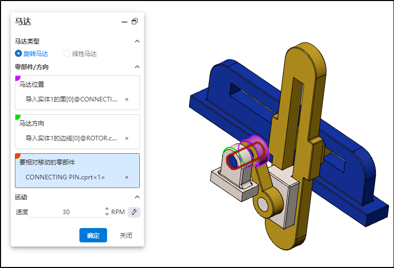 要相对移动的零部件:选择受马达驱动的原动机相对于哪个零部件进行运动。