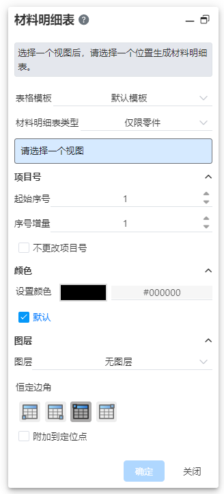 附加到定位点:勾选后可以选择将材料明细表的哪个点与定位点重合,定位点位于标题栏右上角。不勾选则可以任意移动表格位置