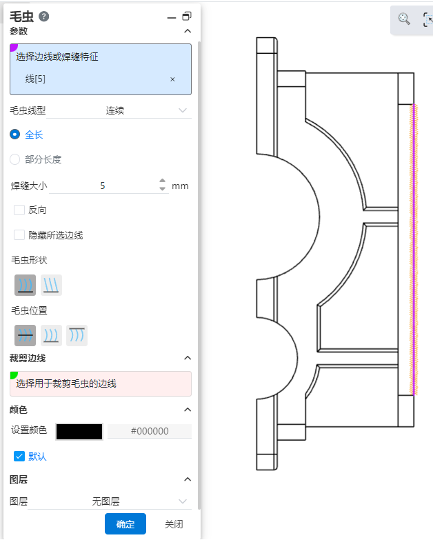 选择边线或焊缝特征:用于选择要生成毛虫的边线,或三维模型中的焊缝特征。