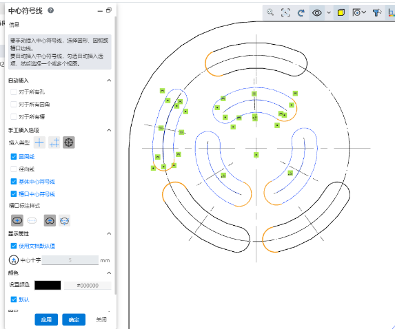 - 在对话框中勾选要为哪些元素自动插入中心符号线。孔-整圆边线,圆角-圆弧边线,槽-直口槽边线。