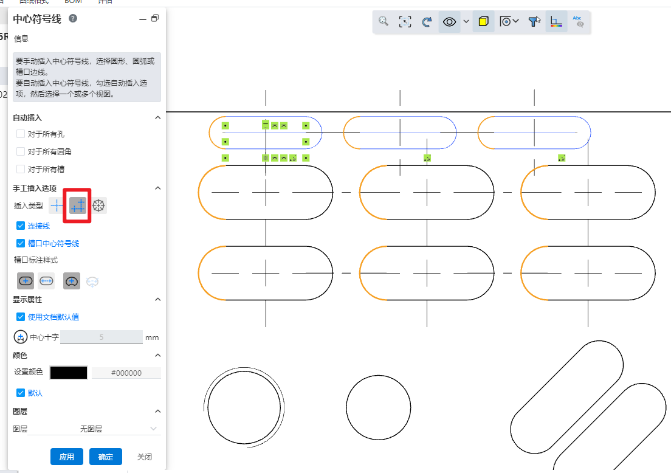 选择手工插入选项:线性或圆形中心符号线。
