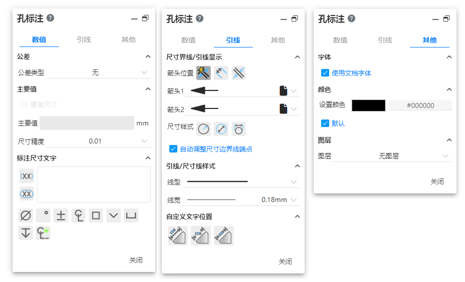 - 孔标注支持直径半径切换。在孔标注对话框“引线-尺寸界线/引线显示-直径/半径”处进行设置: