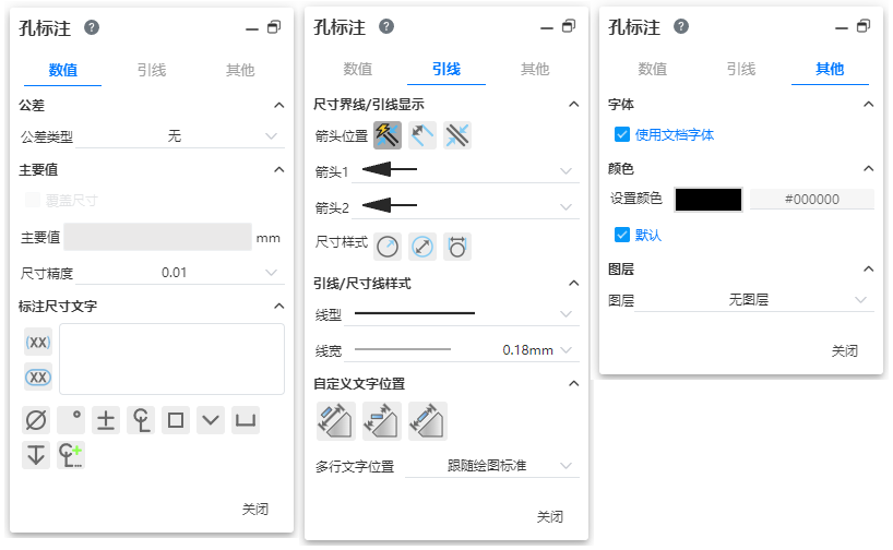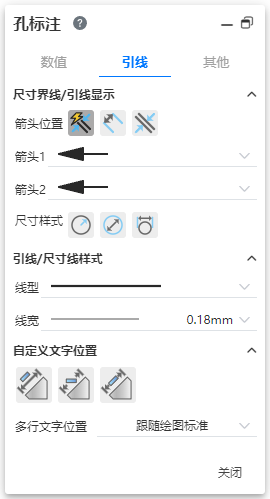 - 孔标注支持自定义文字位置及多行文字位置。其文字位置默认与文档属性及绘图标准保持一致,支持手动切换文字位置。
