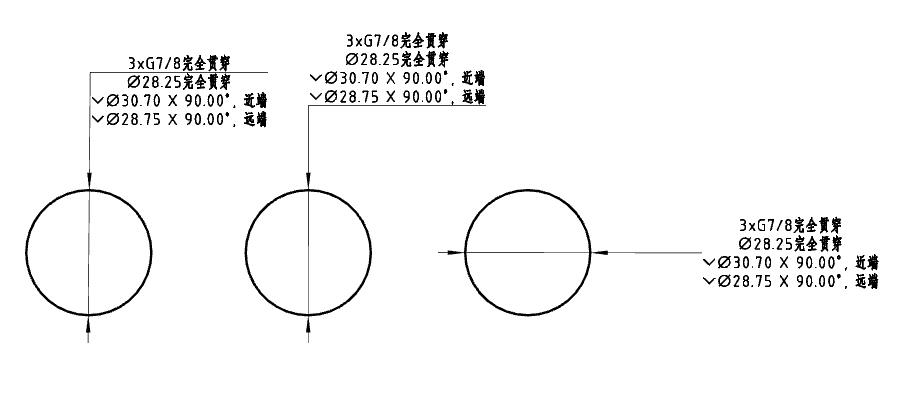 - 标注使用孔命令生成的孔时,可以自动标注沉头/锥孔/螺纹的相关参数,标注效果如下图: