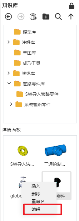 - 当软件中存在管路模块时,知识库中增加管路文件夹,具体内容查看“管路零件库”。