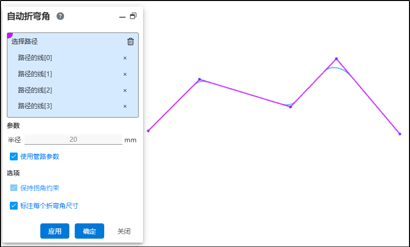 使用管路参数:勾选此项,半径大小不可修改。默认为10mm。不勾选此项,可以自定义折弯角大小。