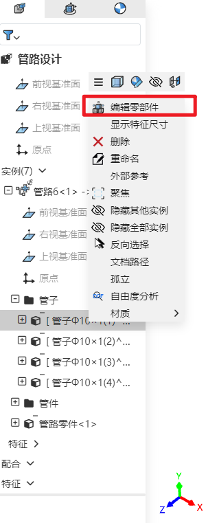 使用方法: 在特征面板中找到管路实例,展开该实例后,找到管路文件夹。展开该文件夹之后,右键管子,点击编辑零部件,即可对管子继续添加特征。