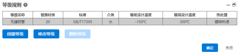 - 在修改等级界面,可以任意对管子的等级信息以及配置属性的参数进行修改、添加、删除、导入导出以及重置。只有系统默认等级规则才可以将数据重置。
