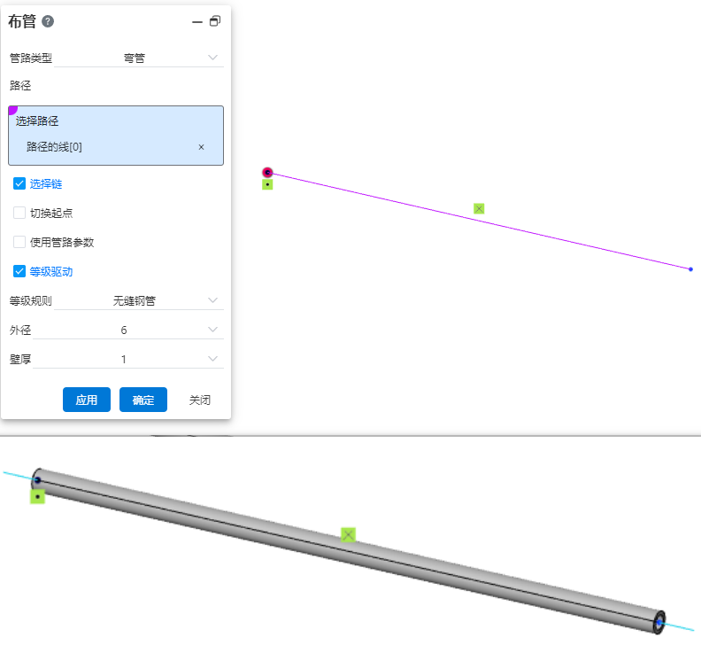 支持直管、弯管和软管三种类型的管子创建,用户无需绘制管子轮廓,仅需要确定管子类型以及参数、等级规则,系统即可自动生成管子。