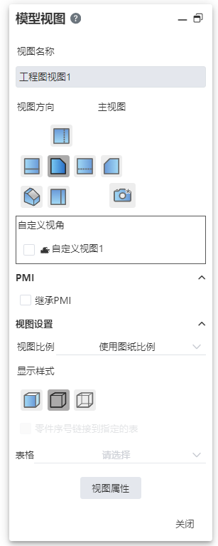 - 自定义视角区域的视角名称前有模型图标的为三维模型中定义的视角,名称前没有图标的为工程图中定义的视角。