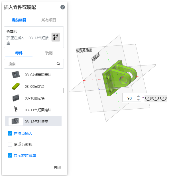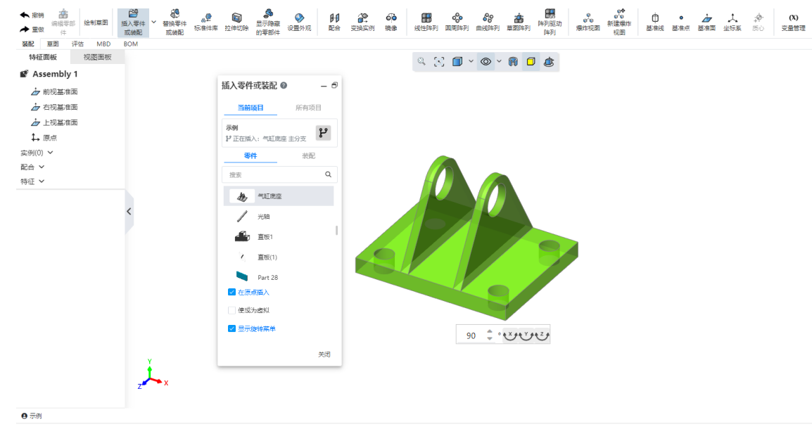 插入零部件时,支持显示旋转零部件快捷菜单,方便设置零部件的方向。