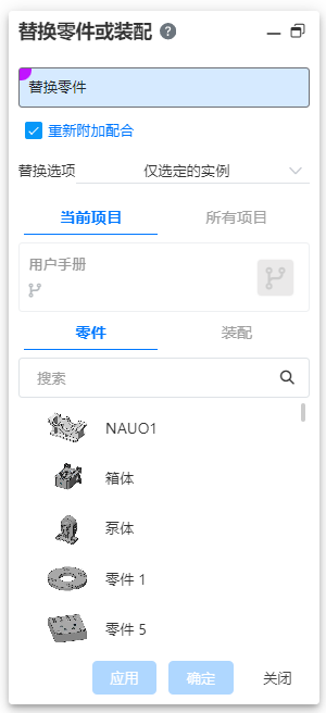 可从当前项目、所有项目或标准内容中选择新的零部件。