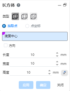 - 类型:选择长方体定位点,支持底面中心、底面顶点、中心三种类型的选择。