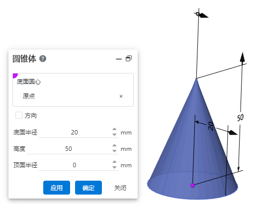 分别输入底面半径、高度、顶面半径值,完成圆锥体的创建;