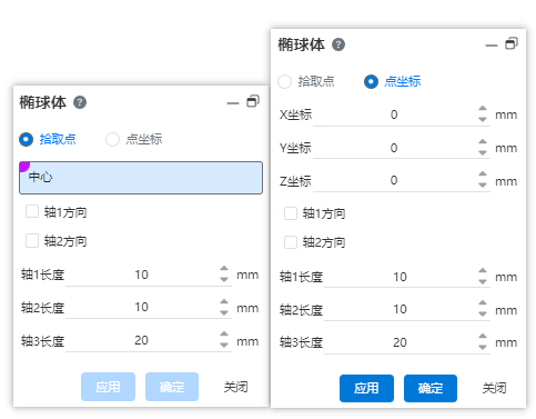 拾取点/点坐标两种方式均可正常创建椭球体。