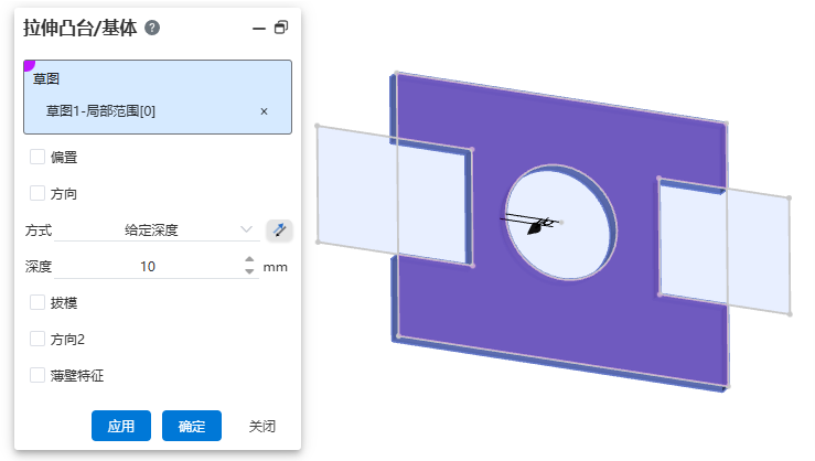 方向:勾选后可自定义拉伸方向,不勾选时拉伸方向默认按照草图法向方向。