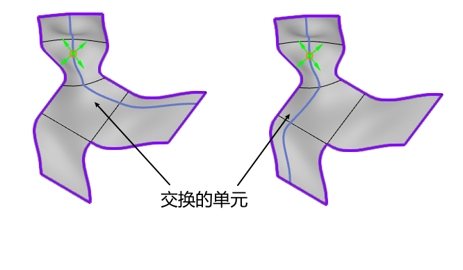 选择已交换的单元:对于多个面片缝合的曲面,在此处拾取面片,改变曲线在该面片上的延伸方向。