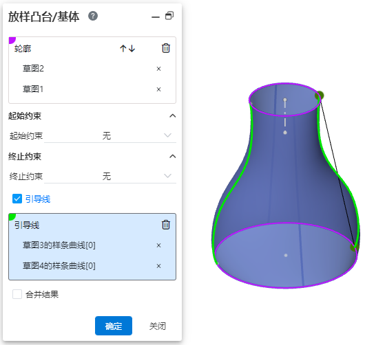 引导线:通过引导线控制放样外部轮廓,可选择草图线、边线或曲线,支持多选。