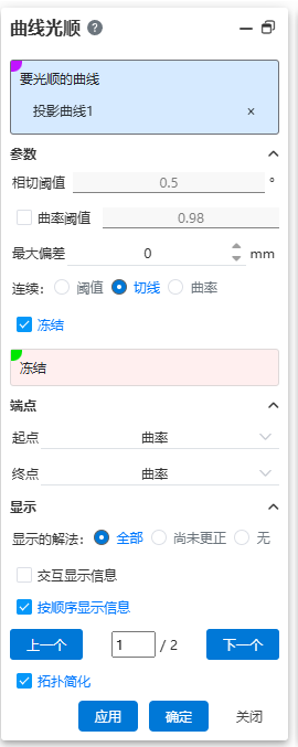端点起点/终点:分别设置光顺结果曲线和源曲线在起点/终点处的连续条件。